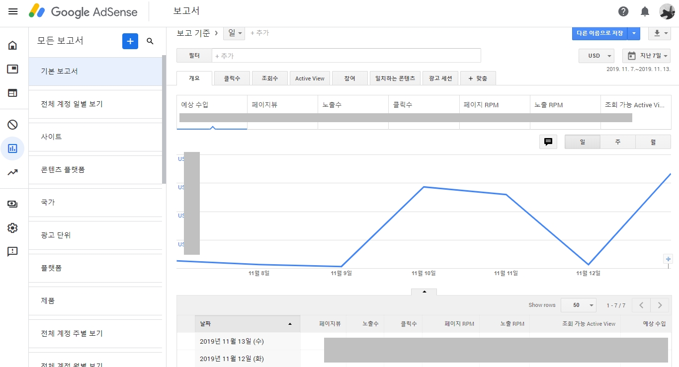 애드센스 용어: 예상수입, 페이지뷰, 노출수, 클릭수, 페이지 RPM, 노출 RPM, 조회가능 Active View