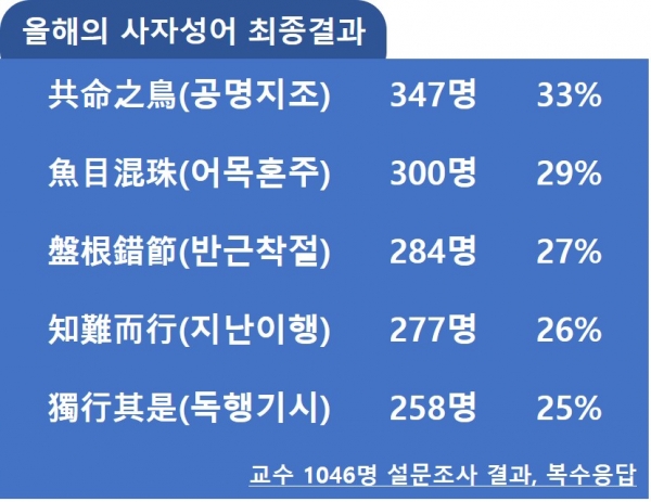 매년 이맘때쯤이면 전국 교수들이 올해의 사자성어를 선정해 교수신문을 통해 발표하곤 합니다.