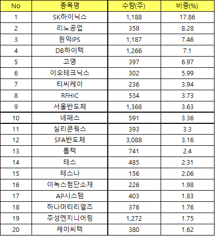 위 표에서 보는 것과 같이 대기업은 SK하이닉스 하나 뿐이고 나머지는 대부분 반도체 장비나 소자와 관련있는 중소, 중견 기업으로 구성되어 있습니다.