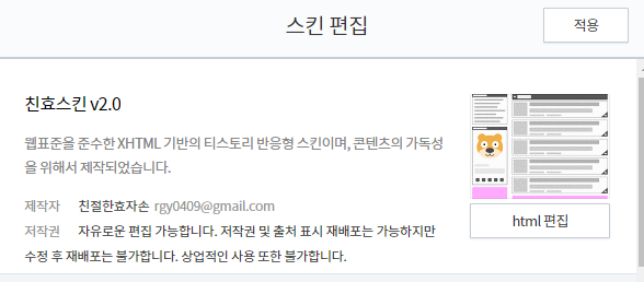 관리자 화면에서 '꾸미기 > 스킨 편집'을 클릭한 후 오른쪽에 있는 'html편집'을 클릭합니다.
