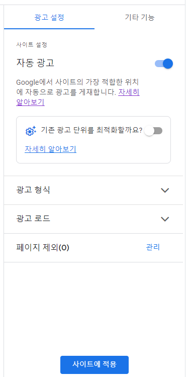 설정화면으로 들어가게 되면 화면의 오른쪽 맨 윗부분에 자동광고를 On/Off 할 수 있는 기능이 있습니다. 여기서 자동광고를 활성화한 후 아랫부분에 있는 '사이트에 적용'을 클릭하게 되면 마무리가 됩니다.