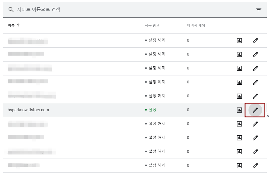 다시 애드센스 페이지로 이동해서 화면의 오른쪽 아래에 있는 아래와 같은 화면에서 자동광고를 넣고자 하는 블로그의 맨 오른쪽 끝에 있는 연필모양을 클릭하면 설정할 수 있는 화면으로 들어갑니다.