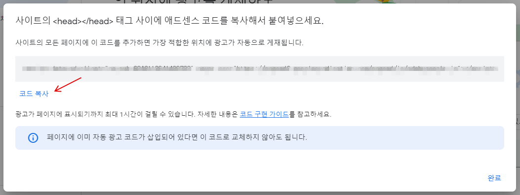 그러면, 코드가 표시되는 창이 하나 나오는데, 여기서 '코드 복사'를 클릭합니다.