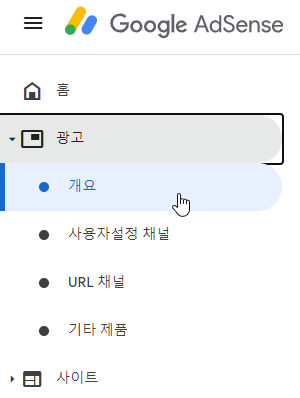 먼저 애드센스로 들어가서 왼쪽 메뉴 중 '광고 > 개요'를 클릭합니다.