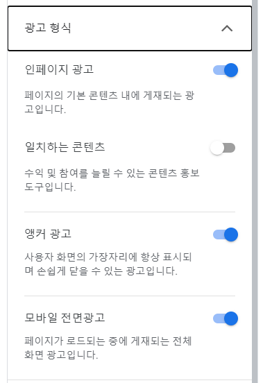 이 내용이 애드센스에서 자동광고가 표시되는 형식을 알려주고 있습니다. 여기서 자동광고로 게재하고자 하는 것을 On 시키면 그 광고가 표시됩니다.
