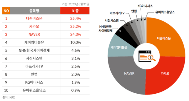 대부분 인터넷 포털, 사이버 결제, 보안, 콘텐츠, 그리고 5G 통신장비로 구성되어 있습니다.