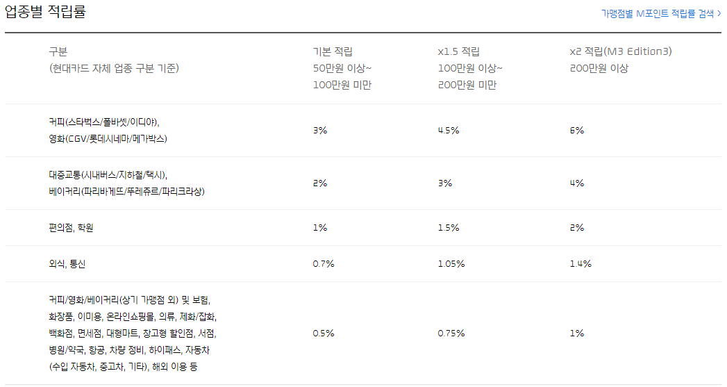 현태 블루멤버스 플래티넘 플러스 카드는 현대차나 기아차를 살 때 2%의 M 포인트를 제공해 주기 때문에 신차를 구매할 때는 꽤 큰 혜택이 있지만, 그 이후 제공하는 혜택은 다양하기는 하지만 실생활에서 많이 사용하는 혜택은 아니라고 할 수 있습니다. 특히, 대형마트 등에서의 적립이 너무 작은 것 같습니다.