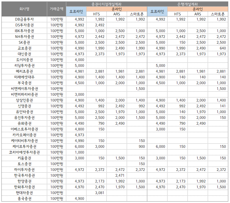 그리고, 동일 증권사에서도 계좌를 은행에서 개설했는지, 증권사에서 개설했는지에 따라 차이가 발생하고, 또 매매 거래를 오프라인, 즉 지점 창구하에서 하는지, 아니면 HTS나 MTS(모바일)에서 하는지에 따라서도 꽤 많은 차이가 발생합니다.