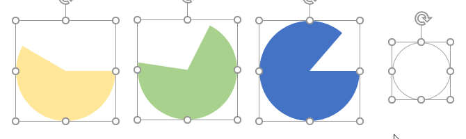 복사한 후 해당 도형을 클릭하면 원호가 잘린 부분에 주황색으로 움직일 수 있는 마크가 표시됩니다. 이것을 클릭 후 드래그해서 원호의 크기를 조정합니다. 다 만든 후 좀 더 디테일하게 수정할 수 있으니, 여기서는 그냥 각 '부분 원호'도형이 서로 다르다는 것만 알 수 있도록 해 주시면 됩니다.