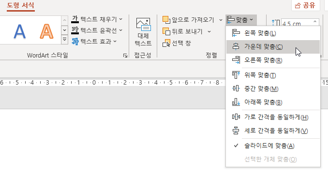 그다음 총 4개의 도형을 선택한 다음 '도형 서식 > 맞춤 > 가운데 맞춤'과 '도형 서식 > 맞춤 > 중간 맞춤'을 실행해 줍니다/